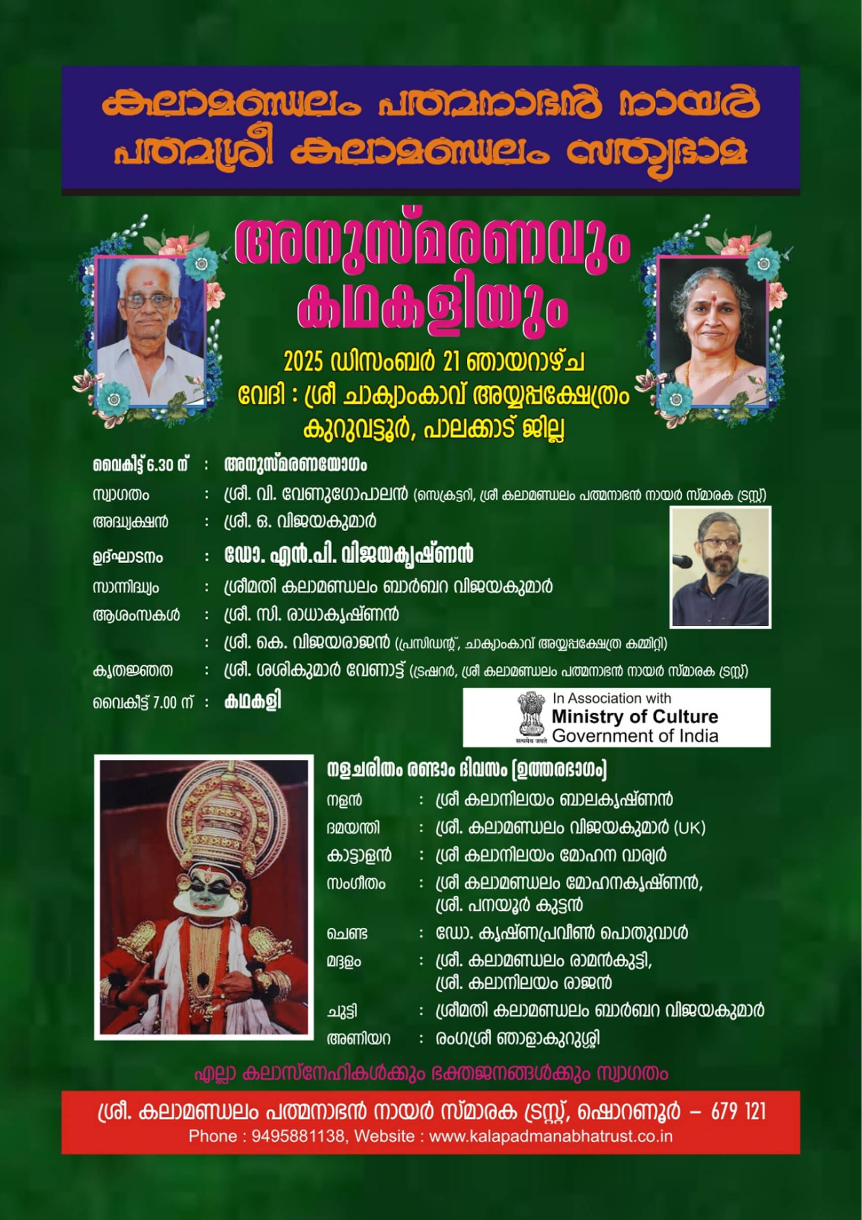 The trust uphold his outstanding and unique contributions to the art of Kathakali as a trainer par excellence, performer and author of authentic books on its grammar and techniques; to preserve and promote the pristine tradition of Kathakali to which the master dedicated his life; to groom young, up and coming up artists; to disseminate the aesthetics of the form among the general public through a variety of programmes, etc., among others.